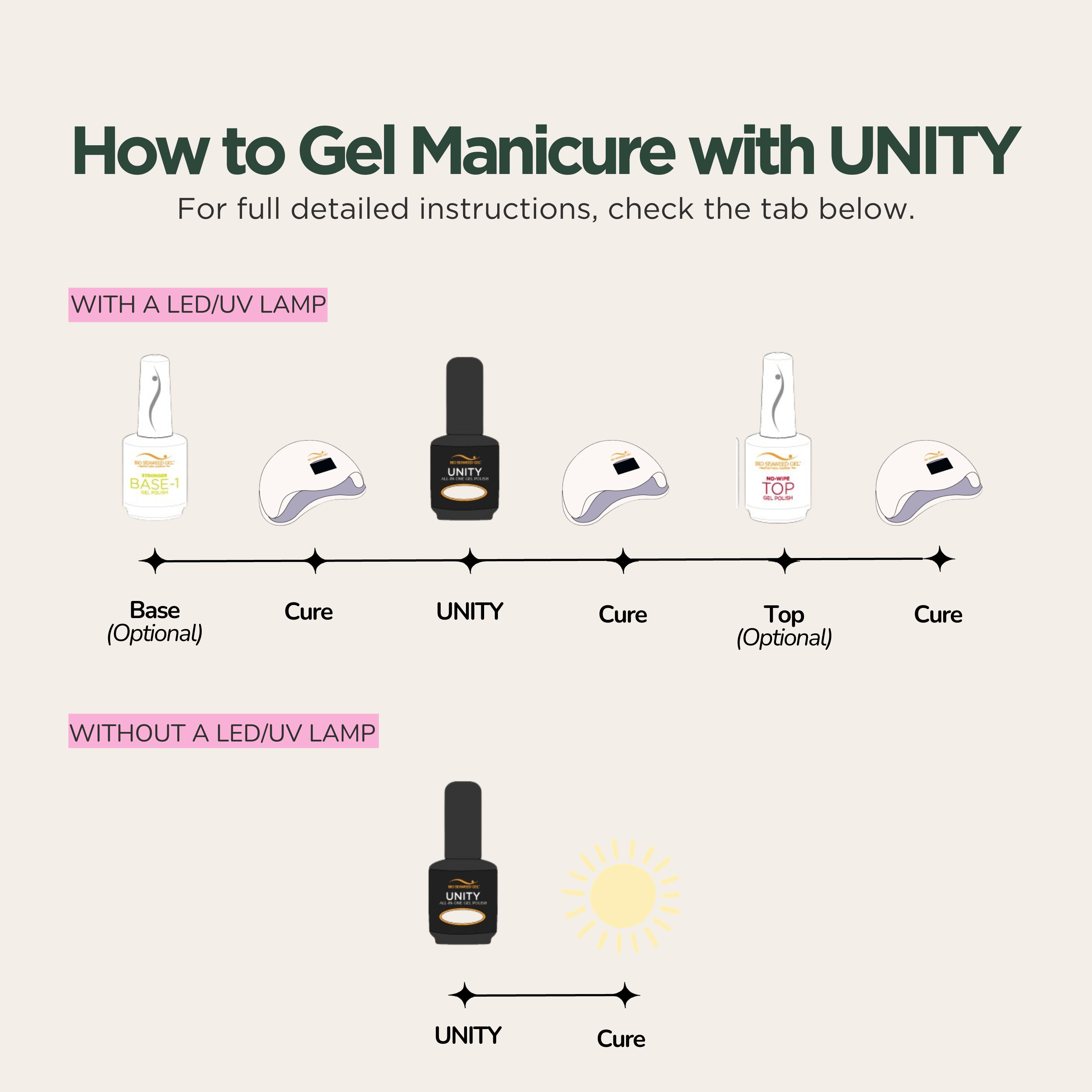 Enjoy a quicker gel polish manicure with our one-step UNITY Gel Polish! UNITY is formulated with top and base- eliminating the need for these steps. UNITY also self levels and cures completely dry- no need to cleanse with alcohol.
