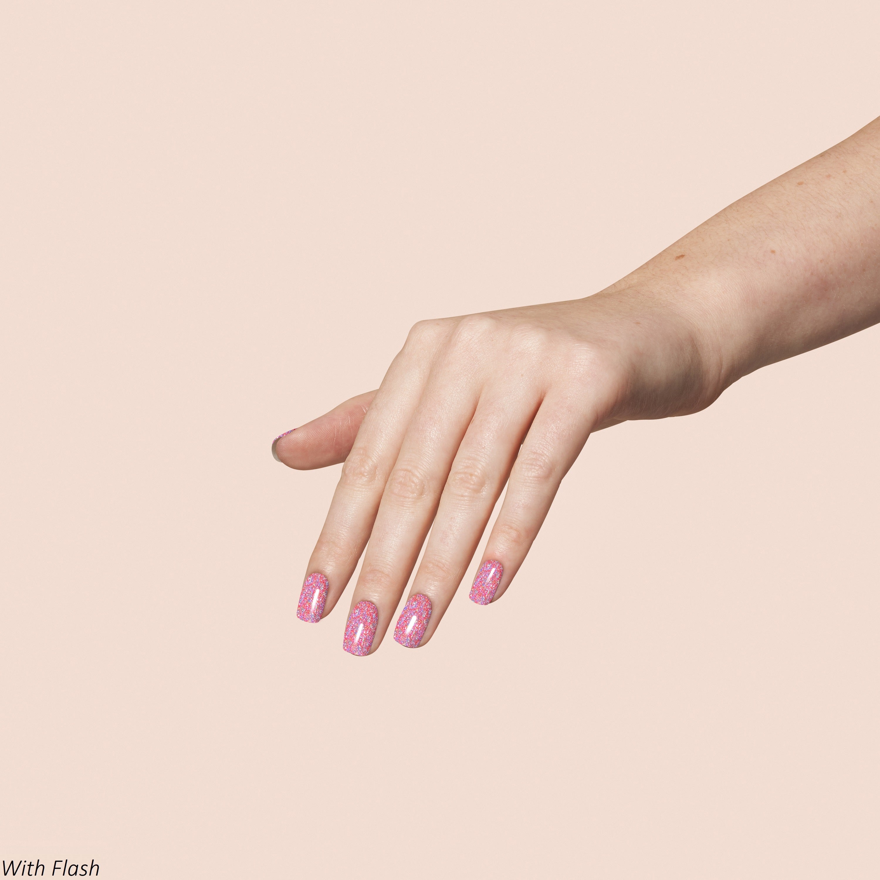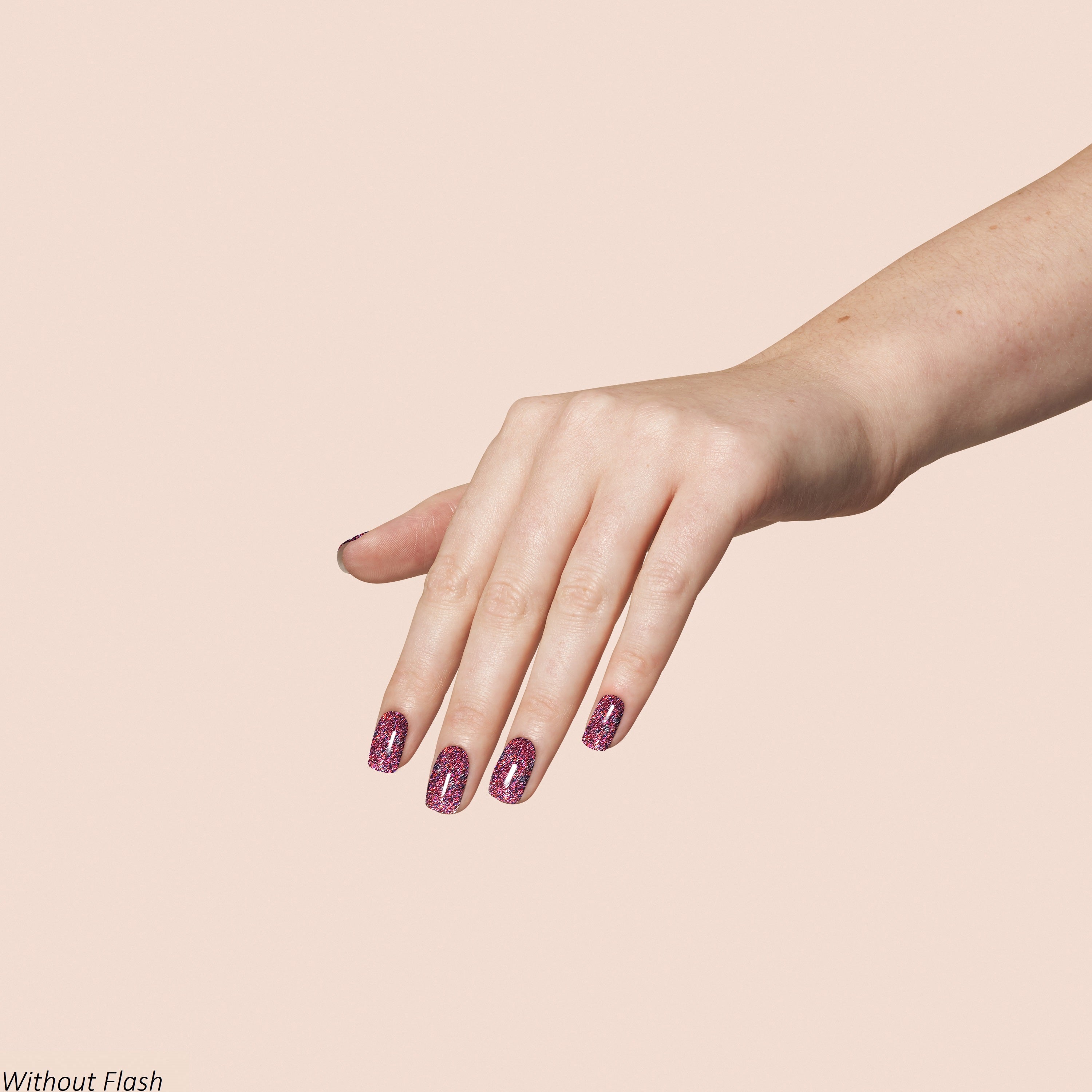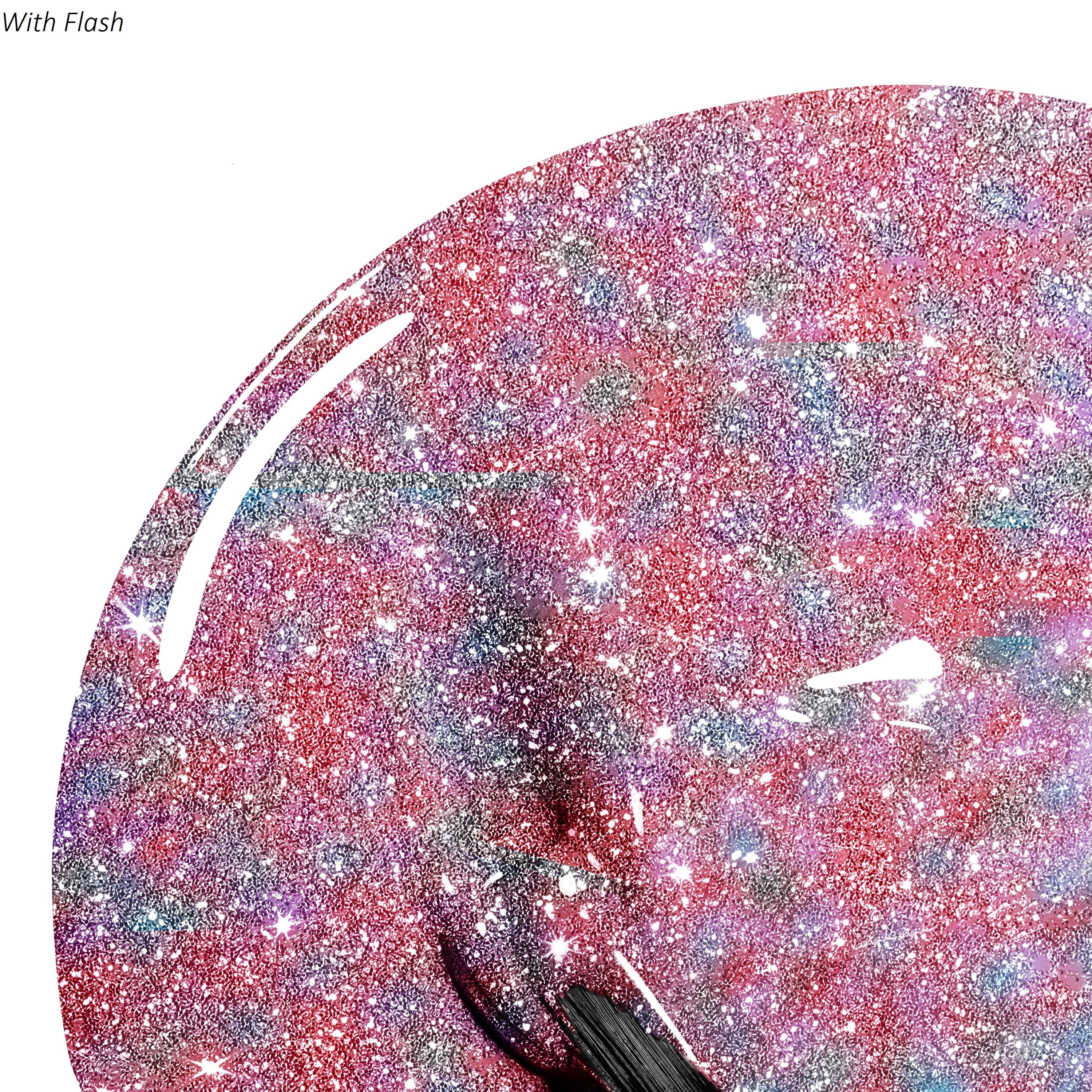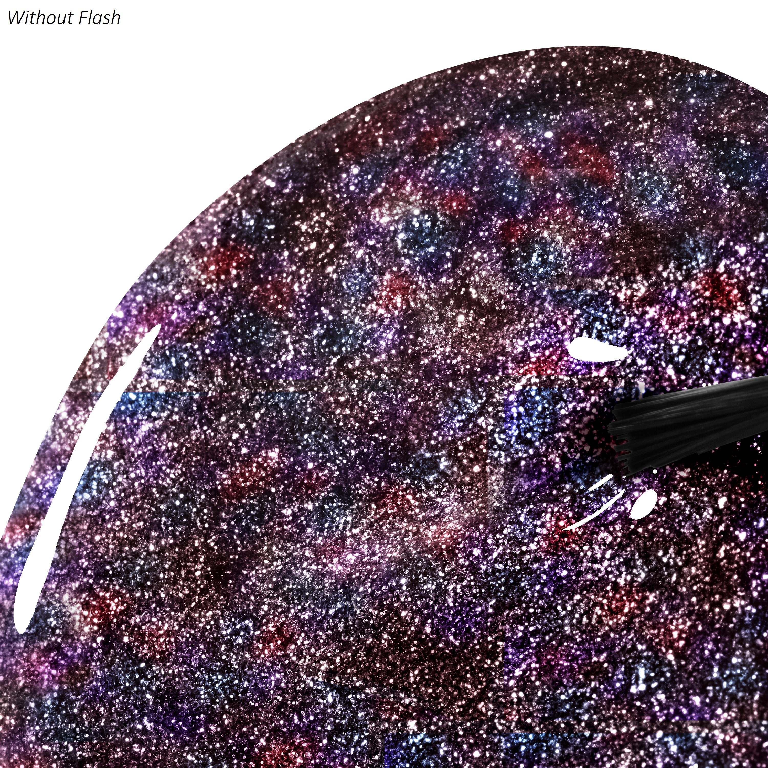 With Flash: A bright sapphire purple with reflective holographic sparkle in a buildable-sheer finish.